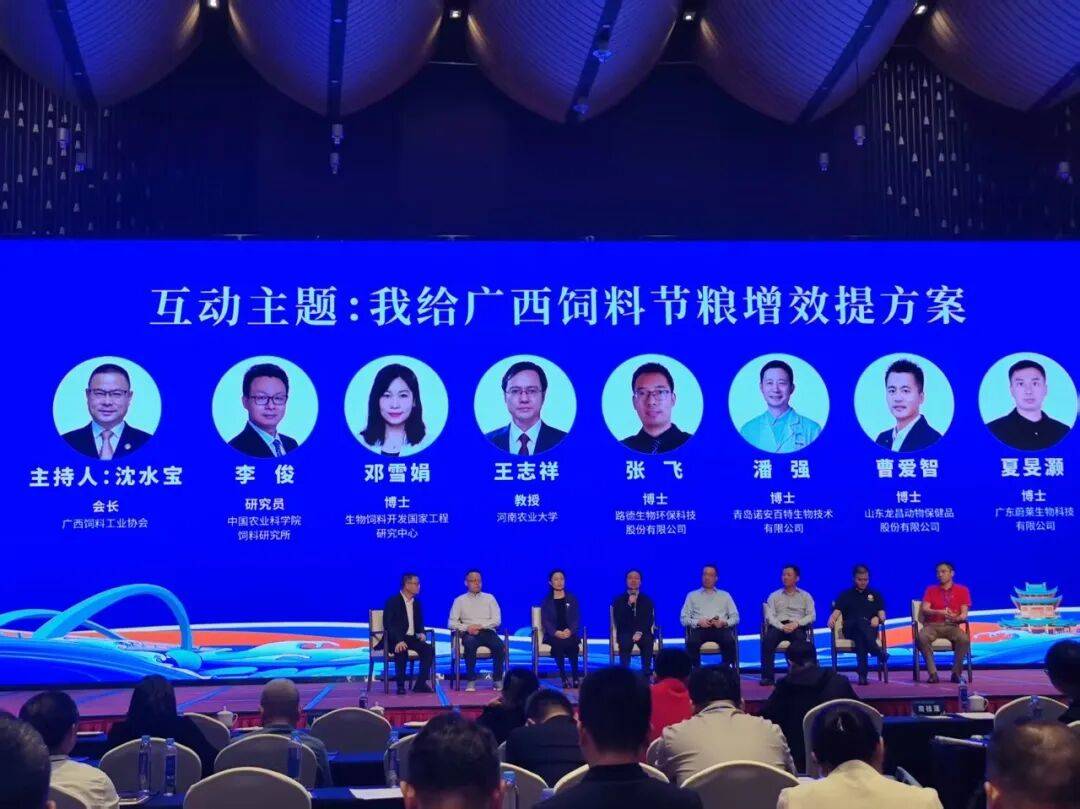 会议互动论坛由广西饲料工业协会会长沈水宝博士主持,论坛邀请了中国农科院饲料研究所研究员李俊博士、生物饲料开发国家工程研究中心副主任邓雪娟博士、河南农业大学王志祥教授、路德生物环保科技股份有限公司产品研发技术总监张飞、青岛诺安百特生物技术有限公司董事长潘强博士、山东龙昌动物保健品股份有限公司科技总监曹爱智博士和广东蔚莱生物科技有限公司夏旻灏博士,论坛以“我给广西饲料节粮增效提方案“为主题,嘉宾们纷纷为广西持续推进饲料粮减量替代,推动养殖业节粮降耗、降本增效建言献策。