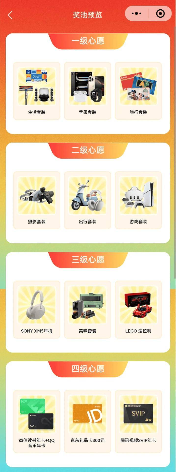 某互联网大厂的年会奖品十分丰厚,一等奖的生活套装之中包括两万元沃尔玛购物卡、戴森洗拖一体机、哈曼卡顿蓝牙音箱,苹果套装包含平板、手机、耳机、智能手表,其余奖品也颇为诱人。