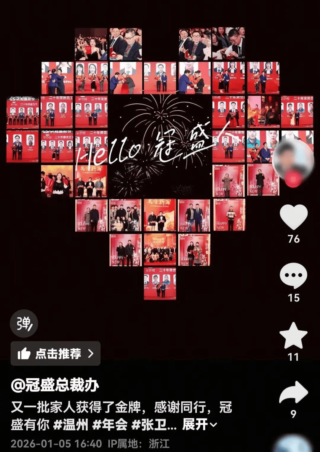 记者搜索发现,名为“冠盛总裁办”的账号在1月5日发布了给工龄20年的员工发放纯金奖牌的视频,员工一一上台领取,并收到一束鲜花,背后的显示屏上是他们的照片和姓名及对应的部门。