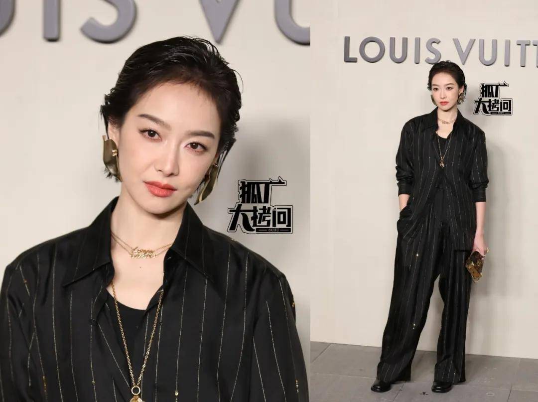 宋茜穿了一套黑色条纹休闲套装,搭配油头短发,很有御姐范。曾几何时她也是留着齐刘海的可爱女生,没想到年纪上来了走偏中性的御姐风也不违和。