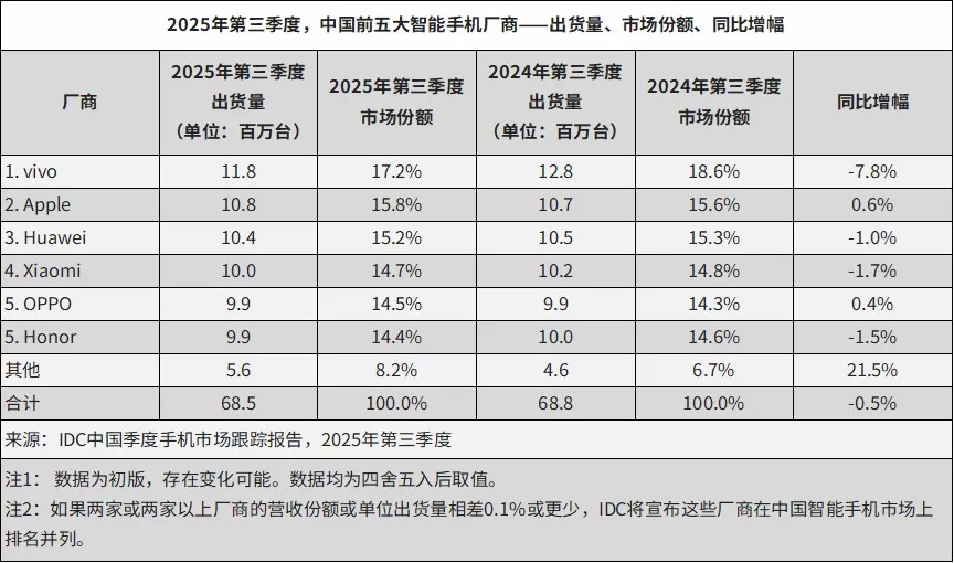 IDC的数据最能说明问题:2025年,vivo全年出货量同比跌了6.6%,是前五名里跌得最狠的;小米虽然全年微增4.3%,但第四季度直接暴跌18%,比华为跌幅还大;OPPO全年微增2.1%,变化不大。