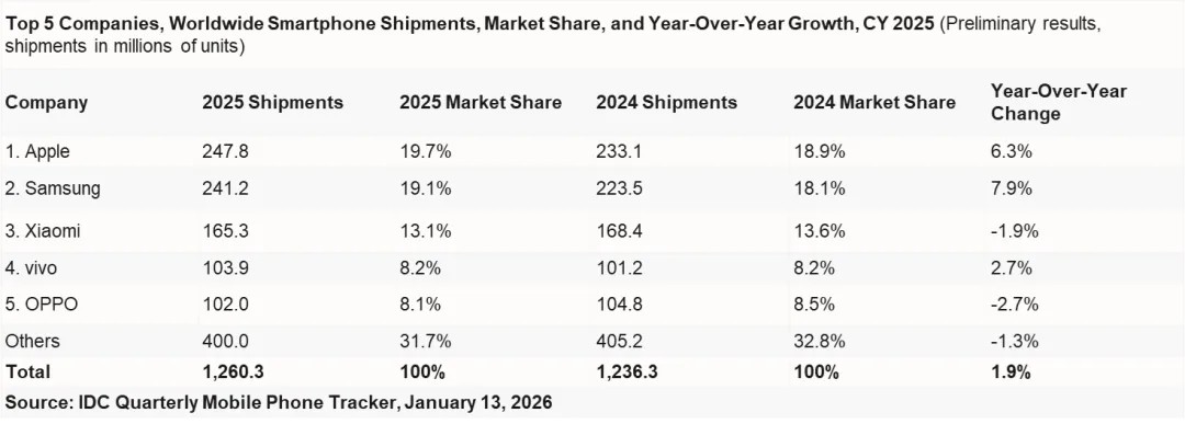 整体复盘2025年,苹果、三星、华为的地位更加稳固,小米、vivo、OPPO的份额则在被挤压,分化加剧。